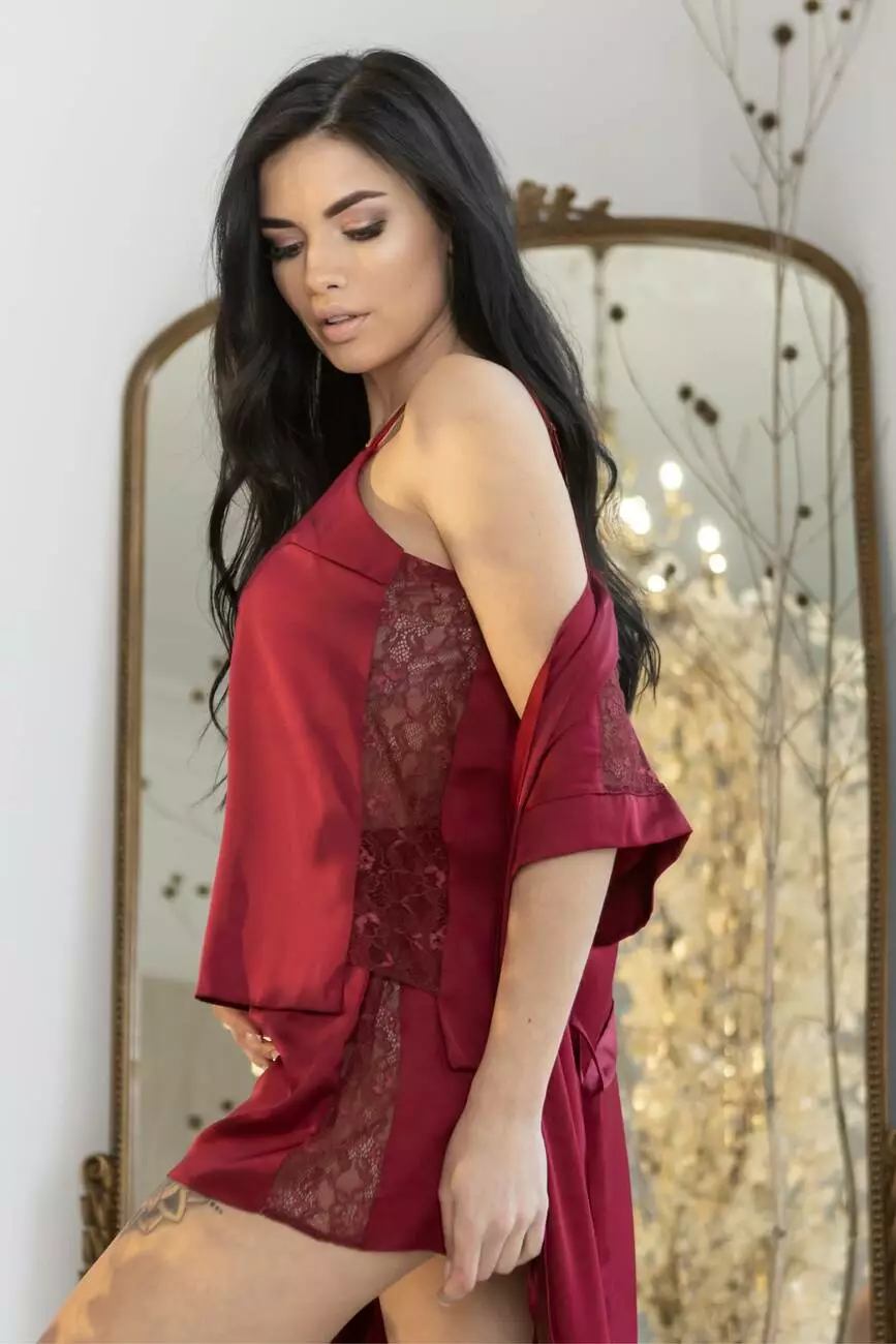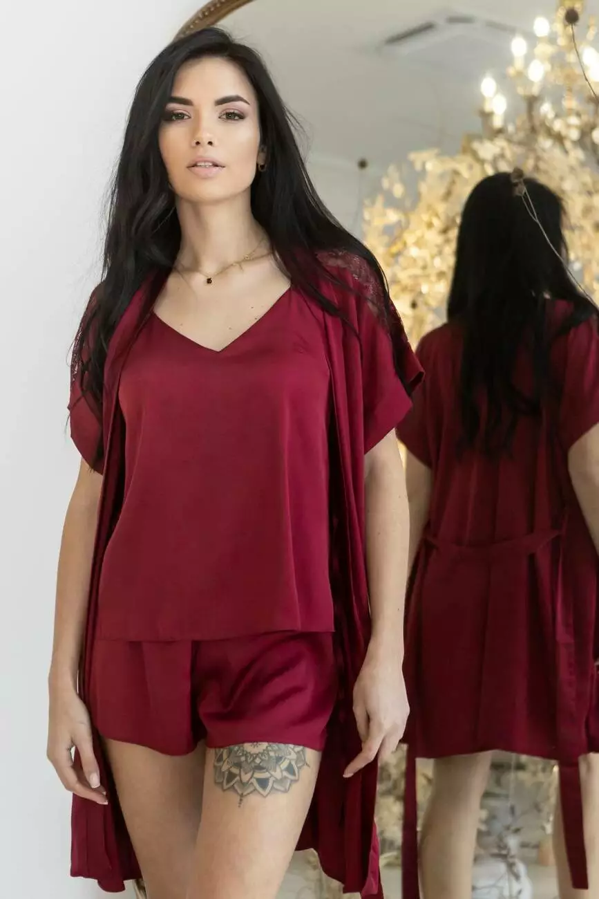 Шовковий комплект для сну Кб1017п  бордового кольору складається з піжами на тонких бретельках та халату.