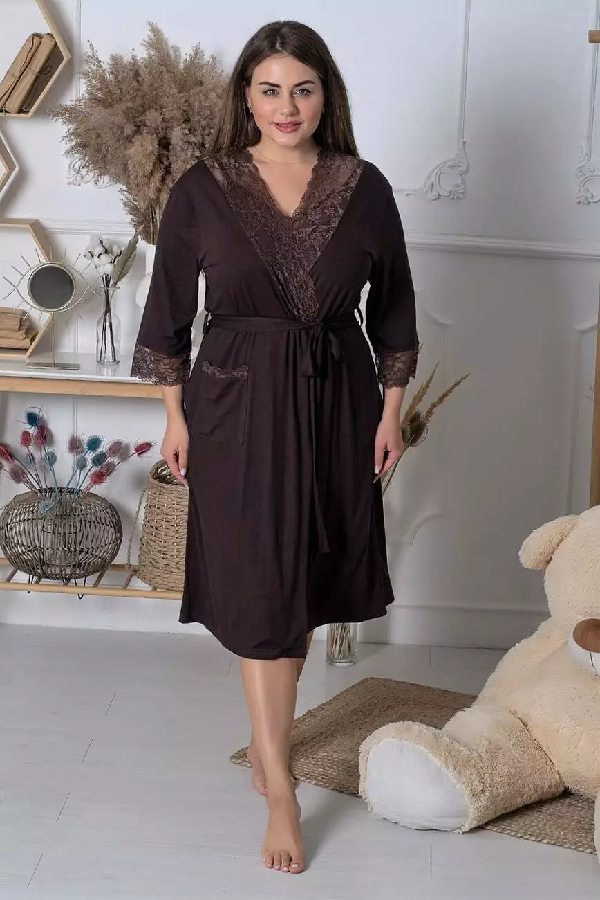 Халат однотонний прикрашений мереживом. Довжина халату – 110 см, в залежності від розміру.