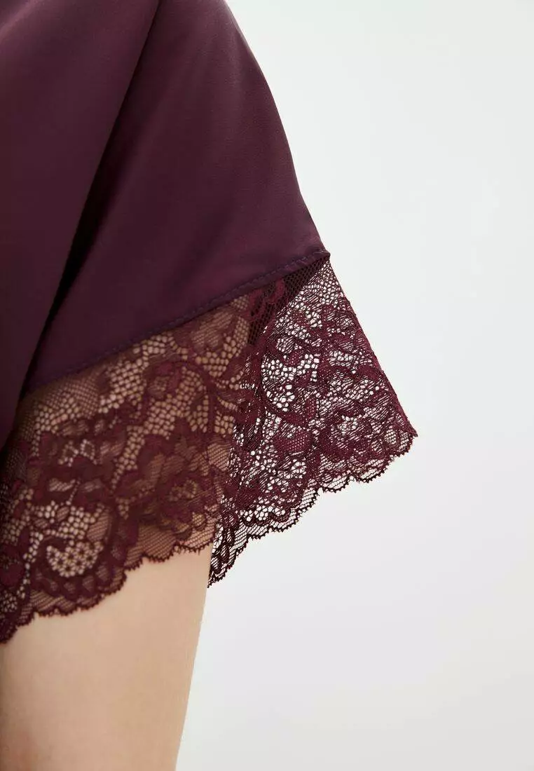 Рукави халату та зона лацкана декоровані мереживом.