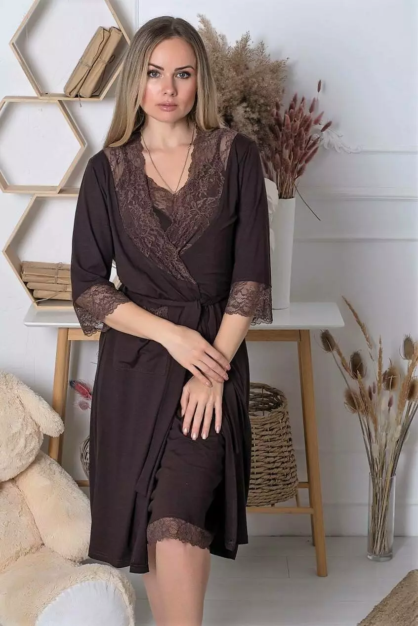 Халат однотонний прикрашений мереживом. Довжина халату – 110 см, в залежності від розміру.