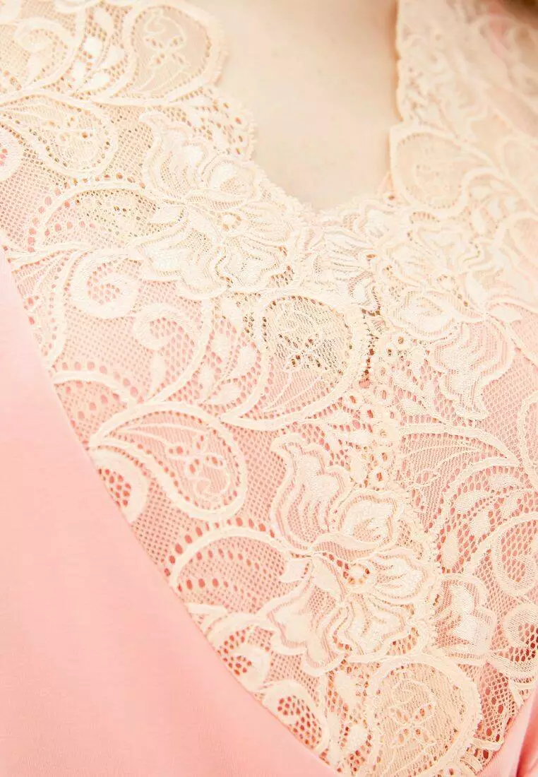 Халат однотонний прикрашений мереживом. Довжина халату – 110-115 см, в залежності від розміру.
