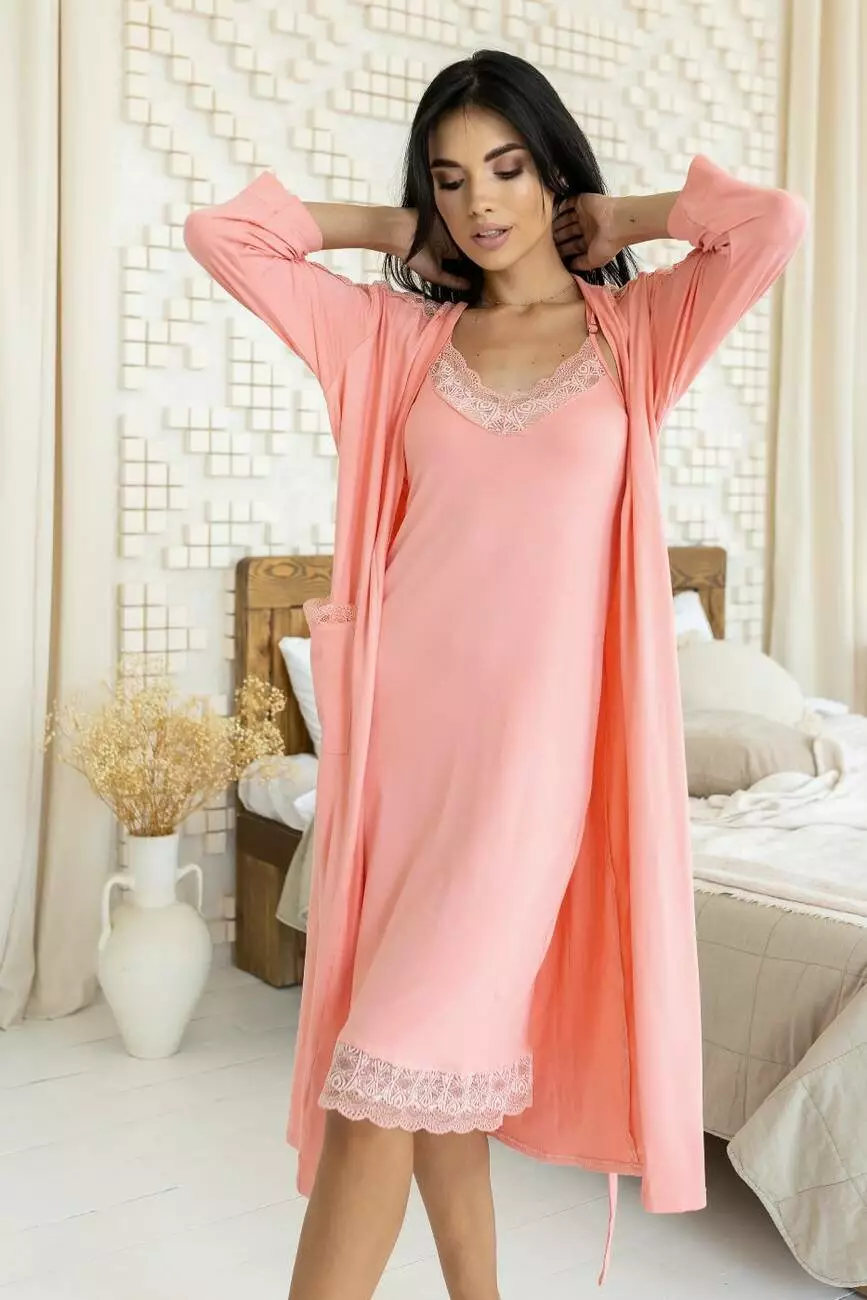 Ніжний комплект для будинку з мереживом у персиковому кольорі.
