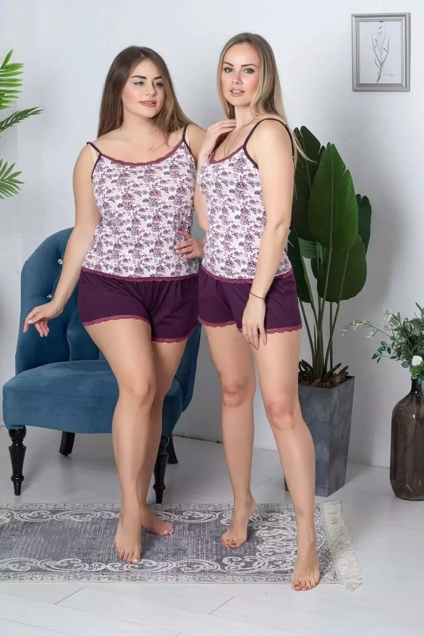 Майка - в дрібну квіточку, декорована мереживом. Шорти вільні однотонні з мереживом.