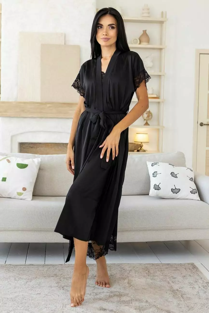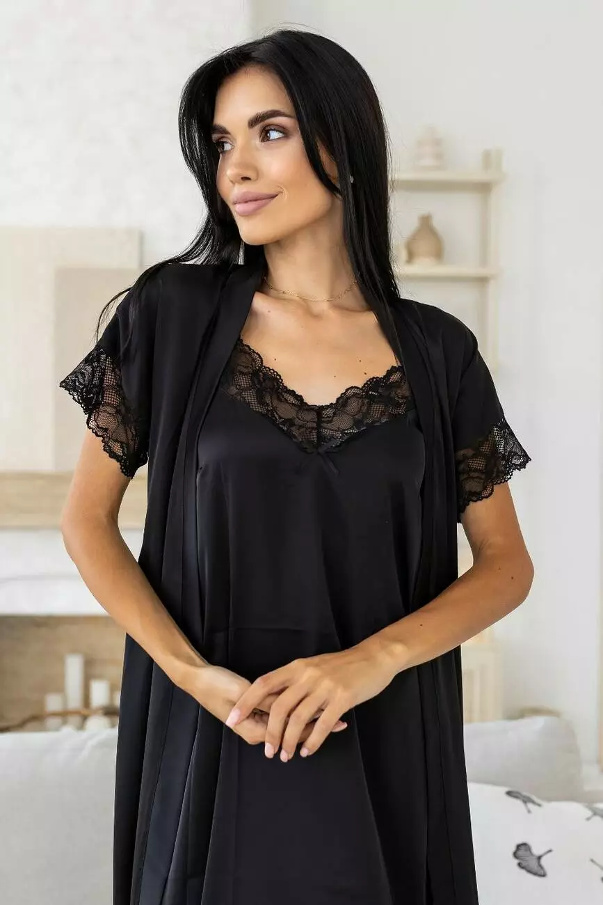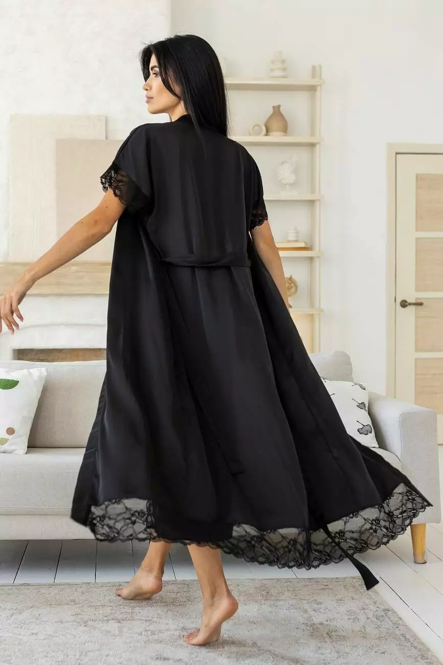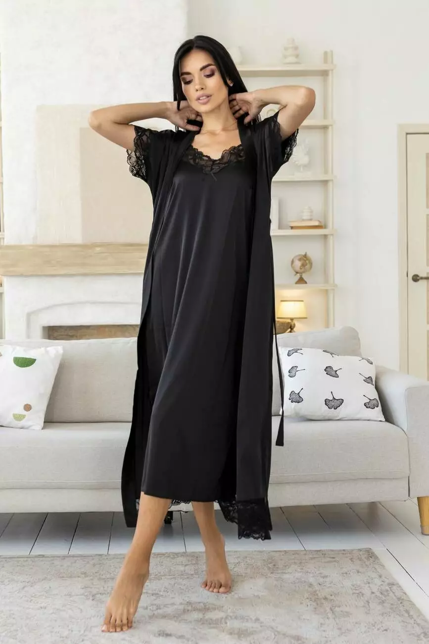 чорного кольору, що складається з елегантного довгого халату та жіночої нічної сорочки, стане вашим улюбленим вбранням для вечірнього релаксу.