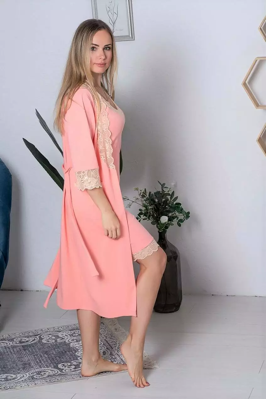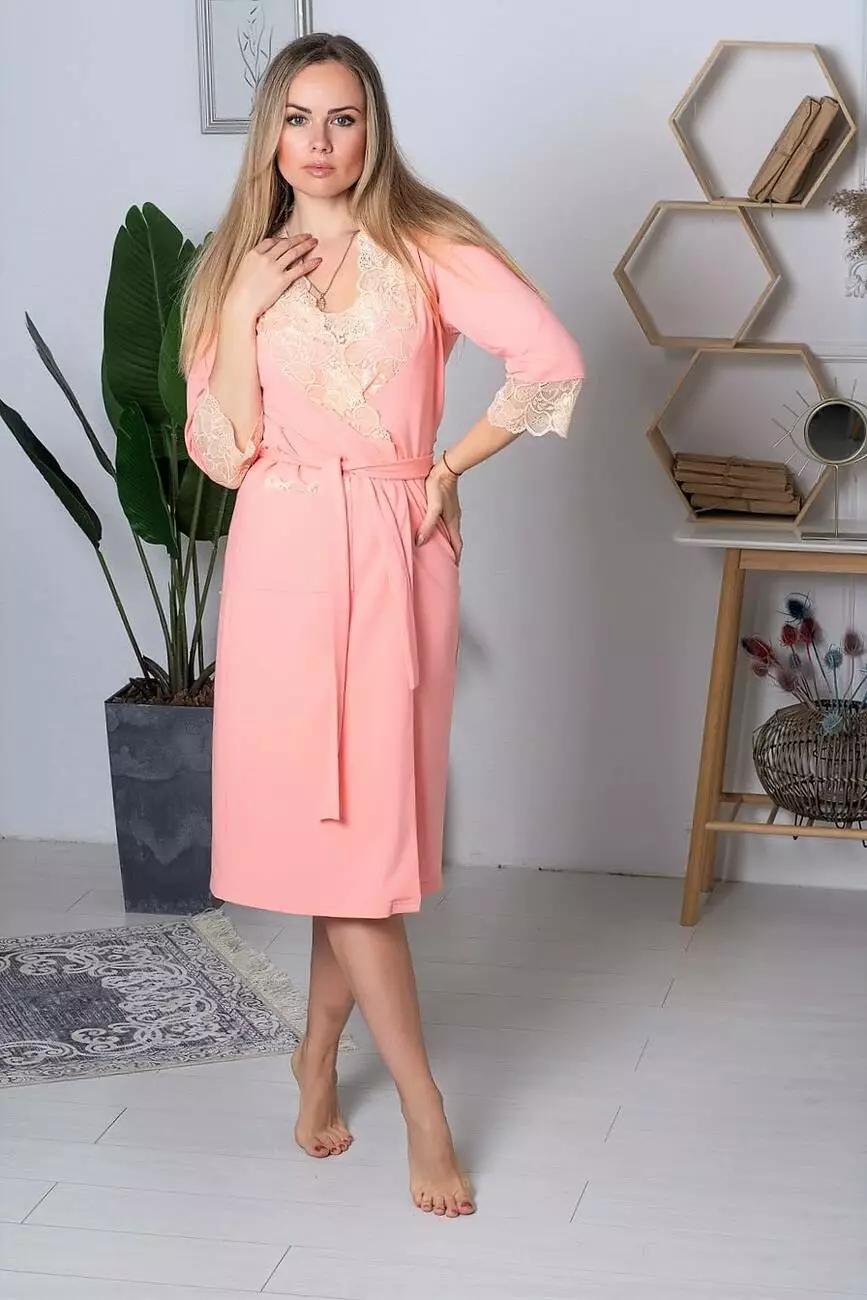 Лаконічний однотонний халат для дому з мереживом на рукавах і